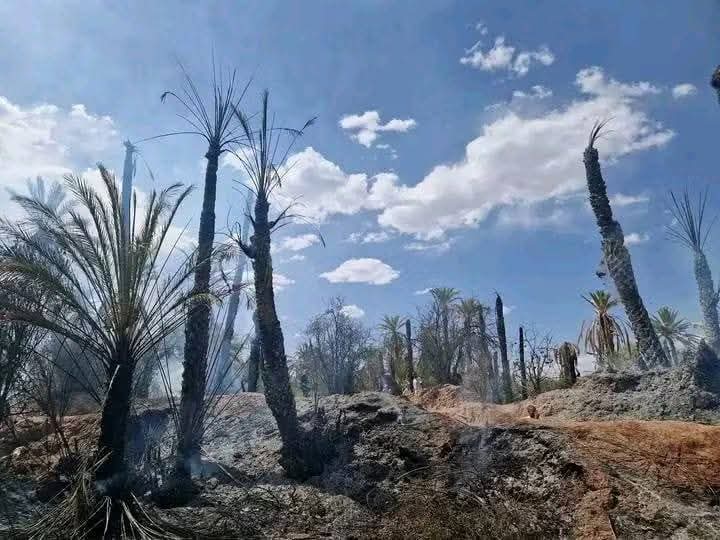 وقد التهمت ألسنة النيران أزيد من 3000 متر مربع متفرقة من الغطاء النباتي، مخلفة خسائر مادية جسيمة أبرزها احتراق ما يفوق 50 نخلة إلى جانب أشجار مثمرة كالرمان واللوز.