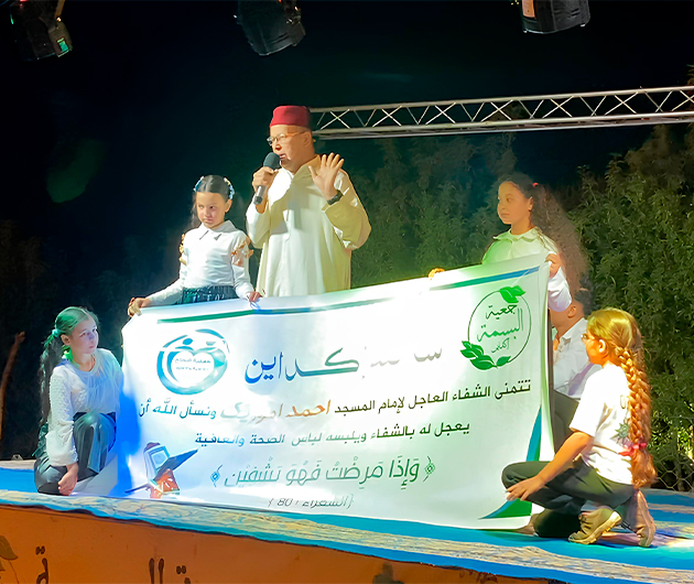 وما إن صعد الإمام المكرم المنصة لتسلم درع التكريم حتى دوى المكان بالتصفيق والهتافات الحارة، وبصوت متهدج تغالبه الدموع، عبر عن امتنانه لسكان القرية بكلمات امتزجت فيها اللغة العربية بالدارجة والأمازيغية فقال: “أشكر جمعية البسمة، وأشكر كل فرد من سكان إكداين، صغيرا كان أم كبيرا، رجلا أو امرأة، لقد وقفتم معي في محنتي، ولن أنسى وقفتكم ما حييت.”